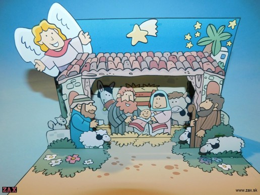 Na stránkach mylittlehouse.org je hromada vystrihovačiek pre deti, ktoré spracovávajú rôzne časti biblie, betlehemov je tam viac, tak si odtiaľto snáď ešte niečo zlepím. Tento betlehem má formu pop-up karty.