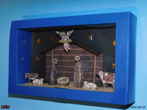 Tento betlehem vyšiel v časopise Kreativní skládanka. Okrem betlehemu boli v tomto časopise aj vianočné ozdoby, krabičky na darčeky...Všetko to bolo síce predseknuté, takže to stačilo len vytlačiť, ale okolo všetkých prvkov zostala modrá obruba, ktorá sa mi moc nepáčila, tak som to nakoniec všetko aj tak musel prerezať...Podarilo sa mi nájsť krabičku vhodnej veľkosti do ktorej som to celé osadil.