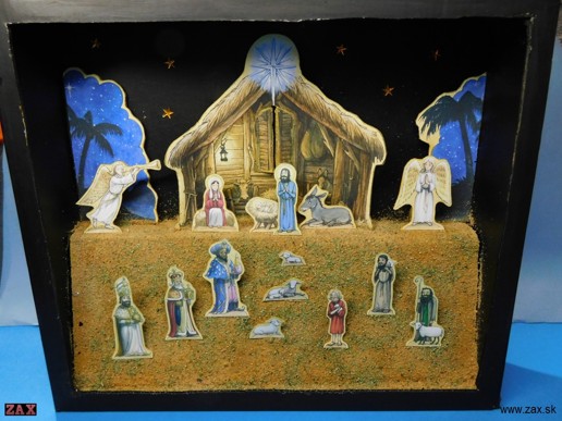 Pekný vánoční betlém od p. Zadražila obsahuje 16 postáv, rozmery 25x19x18cm. Zadná strana obsahuje notový prepis piesne Tichá noc (aj v angličtine a nemčine)