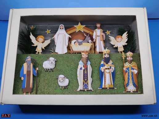 Tento betlehem vyšiel v časopise Šikovníček 12/2015 (autorkou je Andrea Popprová), jednoduchý betlehem umiestnený do papierového boxu, pridal som pár figúr a drobností z časopisu v ktorom vyšiel samotný betlehem: