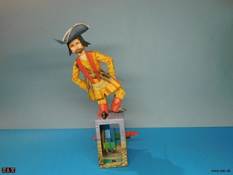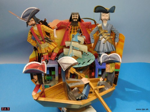 tieto automaty sú z knihy AMAZING AUTOMATA PIRATES! V knihe je celkom 5 roznych piratskych automatov. Je tam pár všeobecných slov o pirátoch, potom každý automat je inšpirovaný nejakým slávnym pirátom, návod na zostavenie a 3 listy s predseknutými dielmi. Strihať sa teda nemusí, ale lepeniu sa nevyhnete...ja som si to ešte zaretušoval...kniha je síce v angličtine, ale návod je obrázkový takže sa to skladá v pohode (naviac diely ktoré sa lepia spolu sú označené rovnakými číslami) Je tam ešte priložené fotopozadie s palubou lode.
