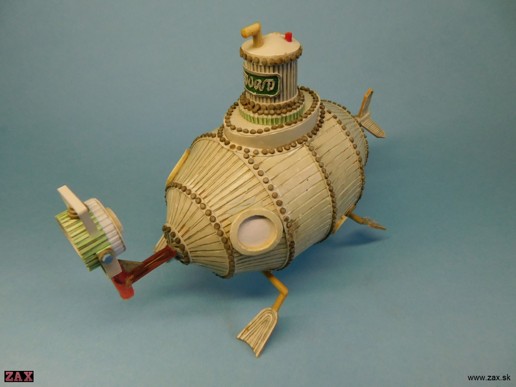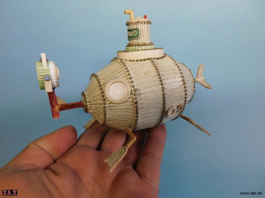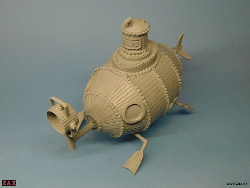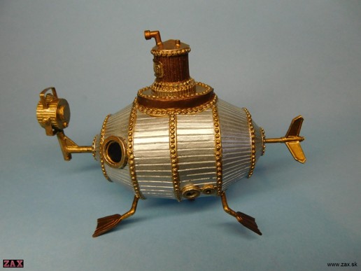 Existuje viacero modelov tejto ponorky, jeden vyšiel v časopise ABC, ja som si vybral free model od Pavla Styla, pretože sa viacej blíži originálu z filmu. Model som upravil, je kompletne striekaný/malovaný s podložkou. Pridal som funkčné svetlo (použil som upravenú el. čajovú sviečku). Trup som oplátoval a onitoval, do priestoru trochu vytiahol všetky detaily. Model som nastriekal základnou farbou, potom trup striebornou metalízou. detaily sú natreté 2 odtieňmi bronzovej farby (Revell a Humbrol), na okná je použitá čierna akrylová farba, vnútro reflektoru je natreté chrómovou farbou, na bronzové časti aplikovaný matný lak (Revell) a na koniec je na celý model použitý čierny suchý pastel na imitáciu opotrebenia. Fóliu som použil na okná, reflektor a periskop. Na osvetlenie som použil LEDku s nepravidelným blikaním, ktorá mi viac pasuje k tomuto steampunkovému vzhľadu. Batéria a zapínanie je na spodu podložky. Rámik v tvare elipsy som si vytlačil na 3D tlačiarni, na podložke som použil kamene, piesok a pár rastlín. Vo filme je ponorka čiernobiela, ja som sa farebne viac-menej držal vzhľadu ponorky, ktorú ponúka múzeum Karla Zemana. Model má svoje chyby, ale v rámci mojich možností som s ním viac-menej spokojný...