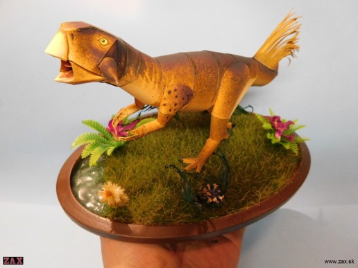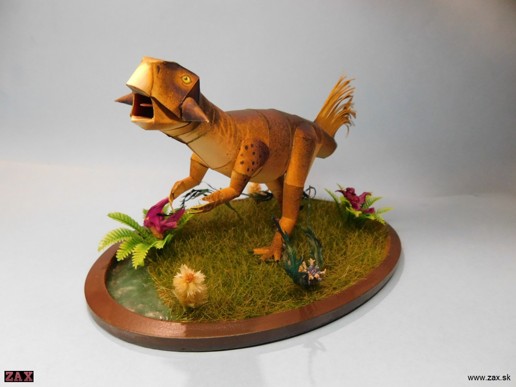 Model je dokončený, trochu som mal problém s čeľusťou a pri lepení nôh som si pomáhal fotkami hotového dinosaura, ktorý zlepil autor. Pridal som podložku, pričom mi veľkostne sadla podložka rovnaká ako pri ponorke Sword, tak som si rámik znova vytlačil na 3D tlačiarni. Na podložku som ešte pridal statickú trávu, plastové a sušené rastliny. Som zvedavý aký dinosaurus bude ďalší.